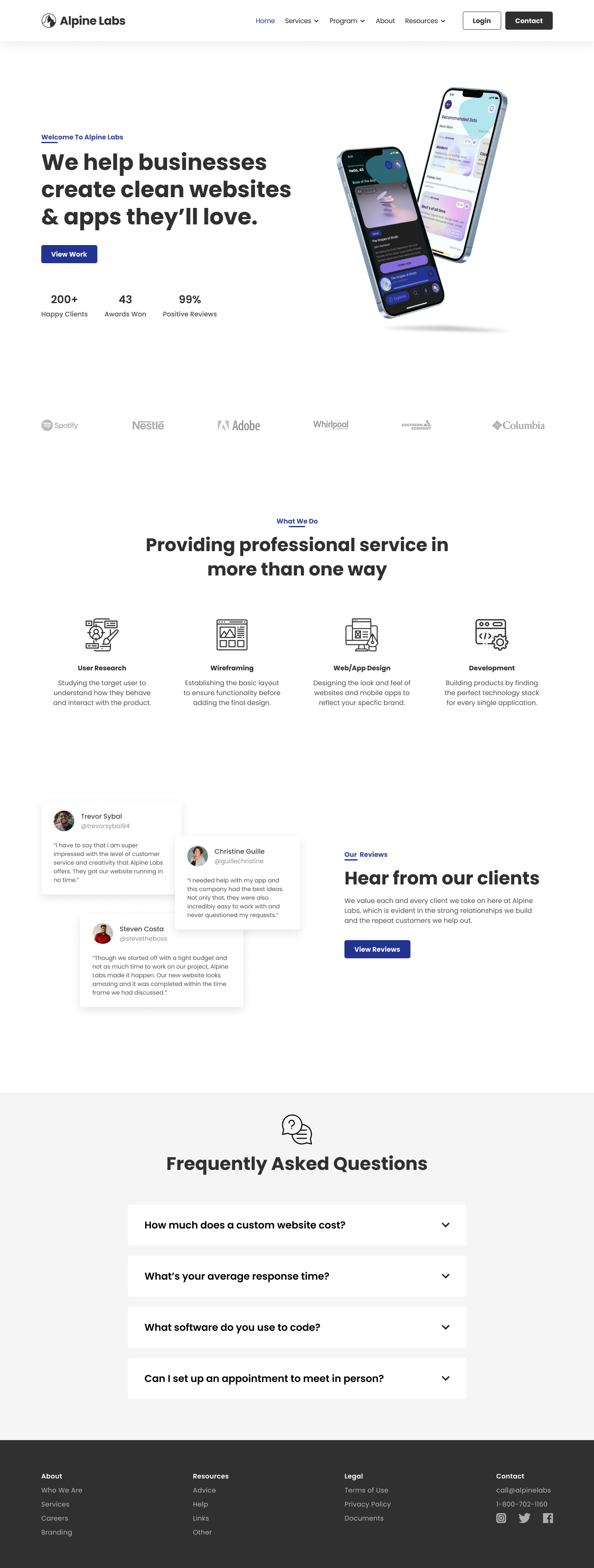 I wanted to create a clean, professional design using a limited color palette and simple graphics/icons. The landing page included the basics—a hero section, client section, about section, review section, and FAQ section.